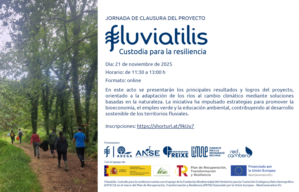 O obxectivo principal do proxecto foi contribuír á adaptación de varios ríos ao cambio climático mediante a implementación de solucións baseadas na natureza. Neste contexto, desenvolvéronse estratexias para promover a bioeconomía e os empregos verdes, así como programas de educación ambiental e voluntariado. Neste evento presentaranse os principais resultados e logros, incluída a publicación “Resiliencia e xestión fluvial: unha guía metodolóxica para o desenvolvemento de accións de restauración de ecosistemas fluviais e a implementación de modelos de gobernanza”.